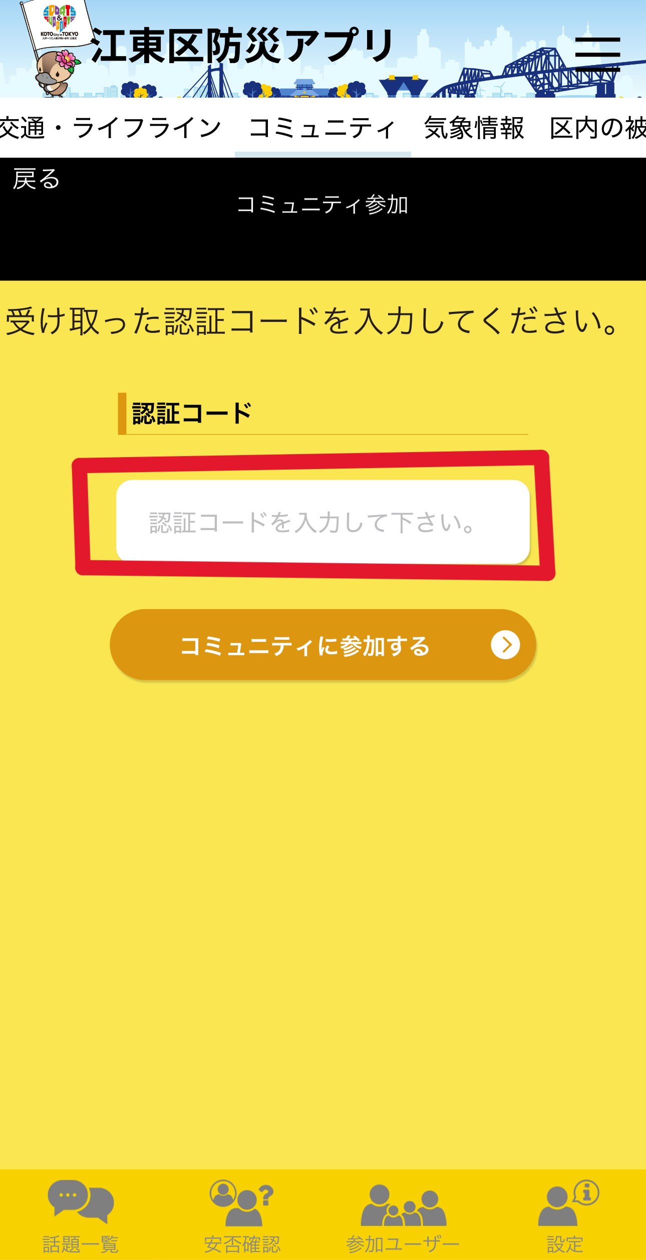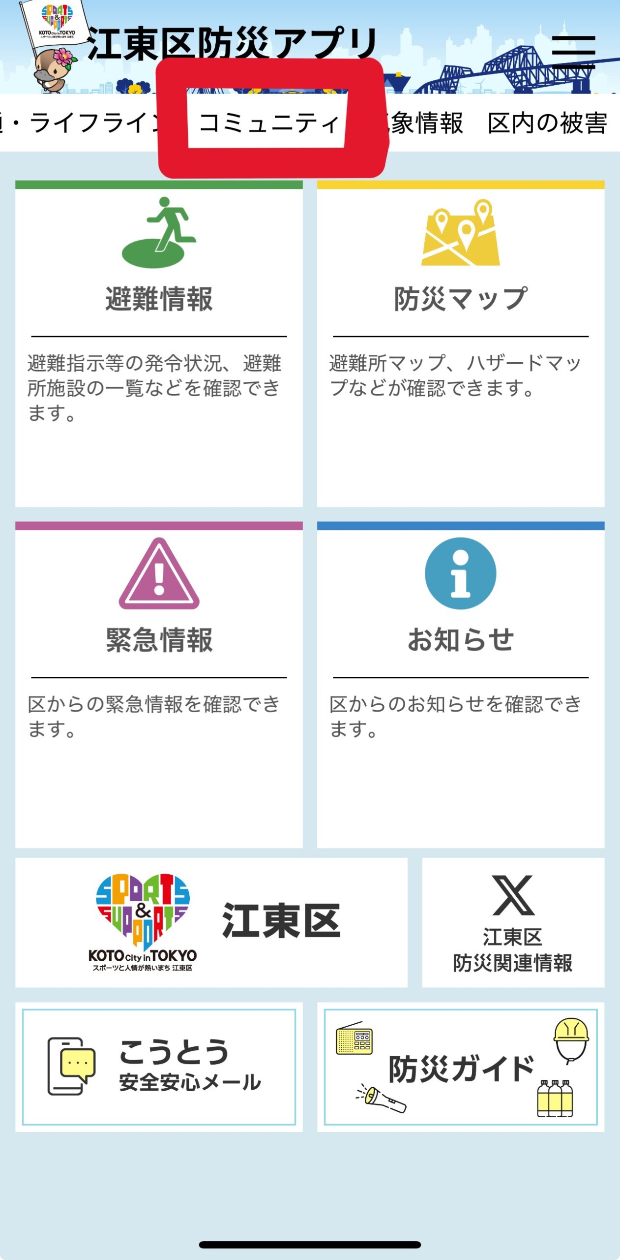 『コミュニティ』機能は、トップ画面一番上にある『江東区防災アプリ』の下にあるバナーに入っています。