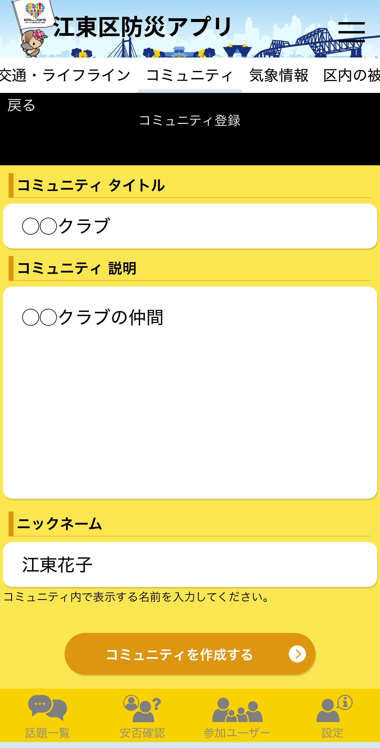 『コミュニティを作成する』ボタンを押すと、『コミュニティ登録』画面になるため、『コミュニティタイトル』『コミュニティ説明』『ニックネーム』を入力します。