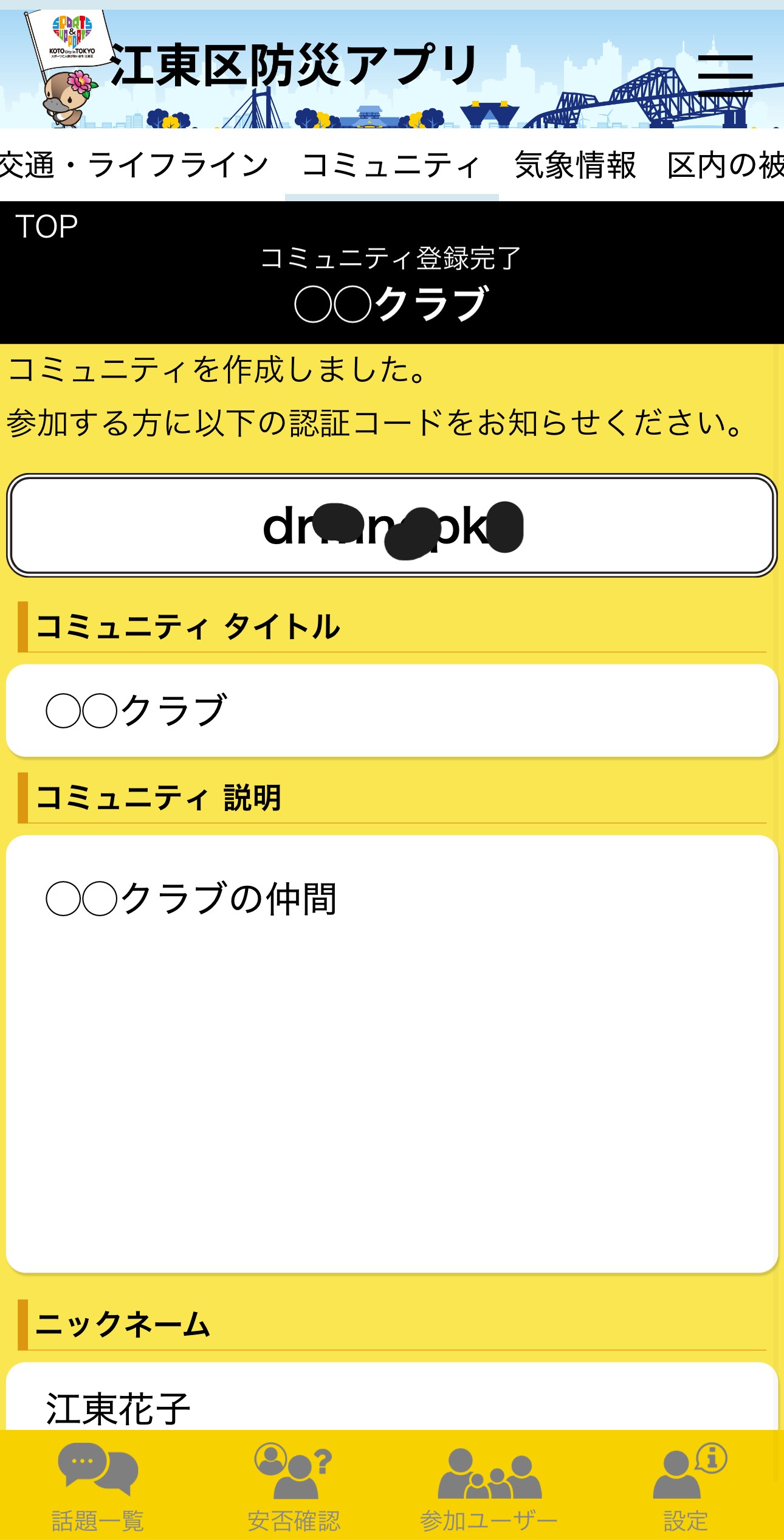 ちなみに、私はグループLINEを使って行いましたが、『これから送る英数字は認証コードになるため、コピーして防災アプリのコミュニティに参加するの際に貼り付けてください』と前置きして認証コードを送りました。
