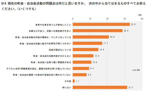 そして、現在の町会・自治会活動の問題点については、『若者や仕事を持つ人が参加しにくい』(33.0%)が一番高い回答でしたが、次が『特にない』(31.5%)でした。