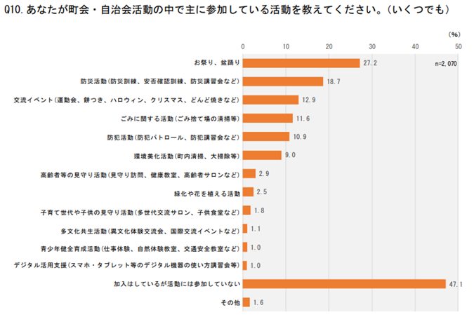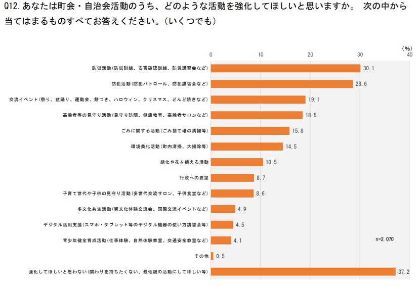 ちなみに、矛盾しているというか私の頭が混乱した部分では、『あなたが町会・自治会活動の中で主に参加している活動を教えてください』の質問には『加入はしているが、活動には参加していない』が 47.1%と半数近くのダントツ一位になっており、『町会・自治会活動内容のうち強化してほしい活動』については、『強化してほしいと思わない(関わりを持ちたくない、最低限の活動にしてほしい等)』が37.2%で一位になっている部分です。