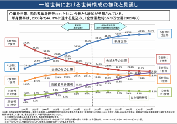 さらに将来推計を見ると、2050年には単身世帯の割合は44.3%、ほぼ“2世帯に1世帯”に近い水準まで増えると見込まれています。