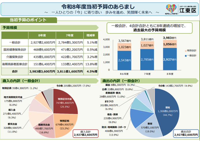 令和8年度予算は、区民一人ひとりの『今』に寄り添ったきめ細やかな施策を展開するとともに、区制80周年を迎える江東区のこれまでの歩みをさらに先へと進め、様々な取組みを加速し、区民の笑顔が輝く未来を創っていく予算と位置づけ、『一人ひとりの「今」に寄り添い 歩みを進め、笑顔輝く未来へ』をテーマに編成されています。