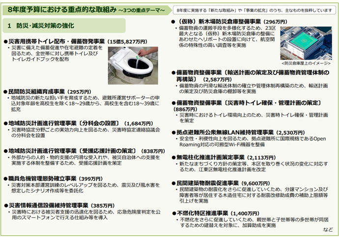 防災・減災対策についてですが、携帯トイレやガイドブックの配布、防災倉庫の機能強化など、実効性の高い取組が進められています。